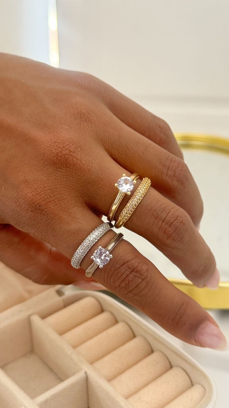 Anel duplo solitário/ aparador Folheado á ouro18k e a prata em ródio branco.