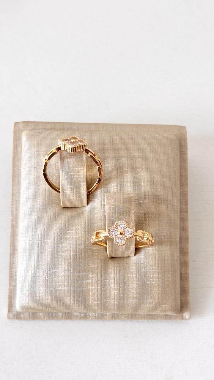Anel deslumbrante com design de trevo cravejado de zircônias, simbolizando sorte e elegância. A peça é realçada por delicados elos, que conferem um toque moderno e sofisticado ao acessório.