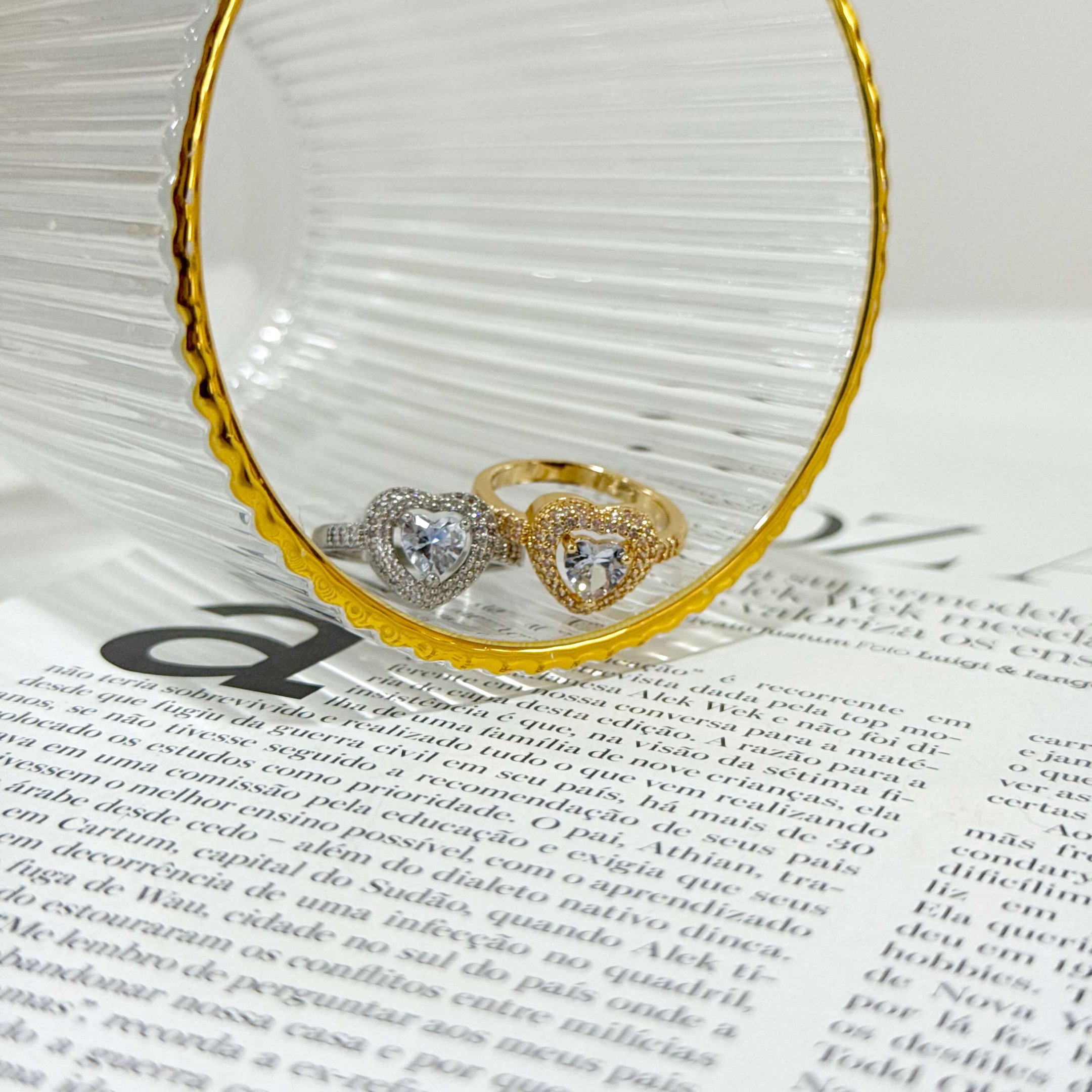 Anel delicado com design de coração cravejado com zircônias, perfeito para trazer romantismo e brilho ao visual. Produzido em semi joia de alta qualidade, com banho em ouro 18K e camada de verniz protetor para maior durabilidade. Hipoalergênico e confortável, é ideal para uso diário ou para presentear com muito charme.