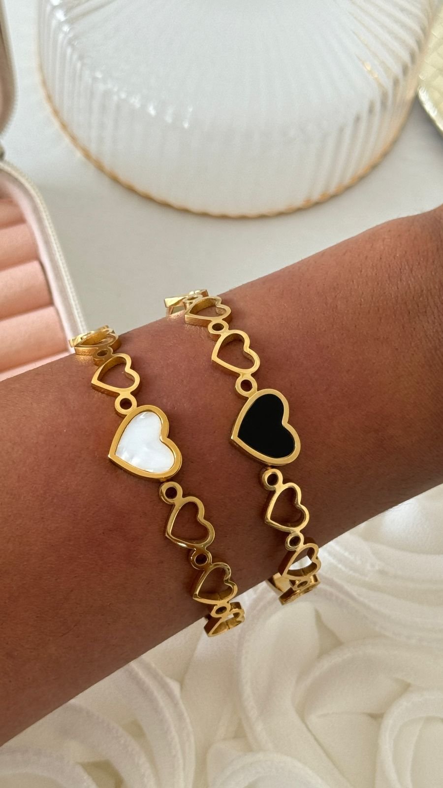 Bracelete corações em aço inoxidável dourado e prata.