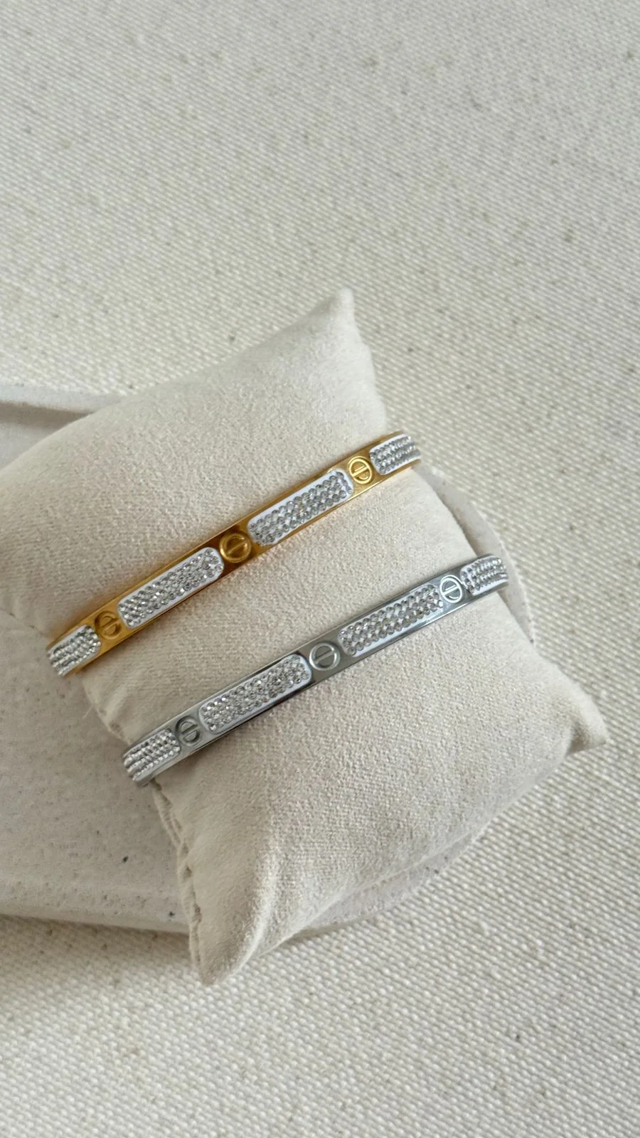 Bracelete Cart com pedras cravejadas, em aço inoxidável dourado e prata.