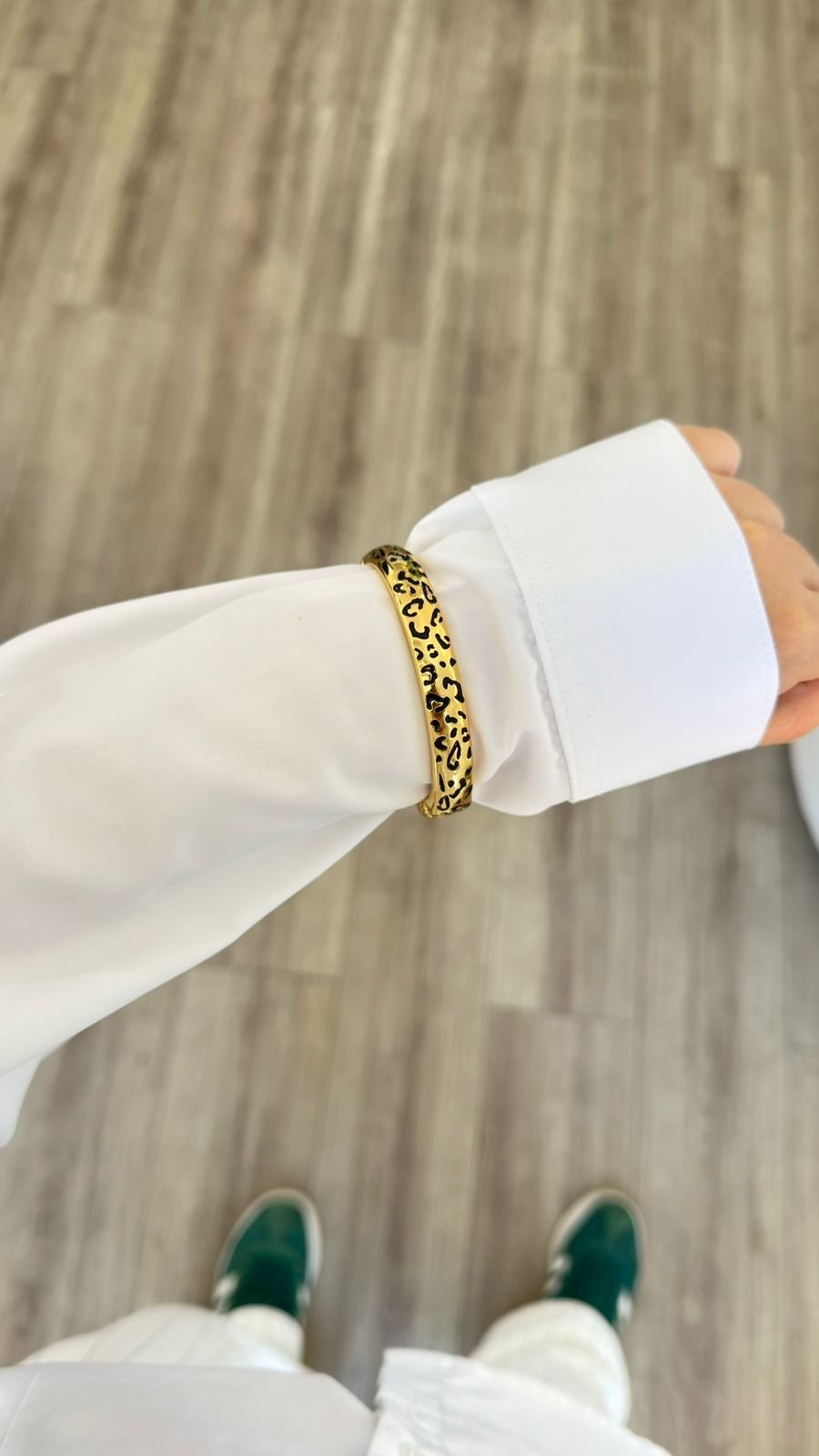 O Bracelete Animal Print Onça é uma semijoia imponente com banho dourado e estampa de onça em alto-relevo, ideal para quem busca um acessório moderno e cheio de atitude. Com acabamento espelhado e design rígido, é a peça perfeita para elevar qualquer produção com personalidade e estilo.