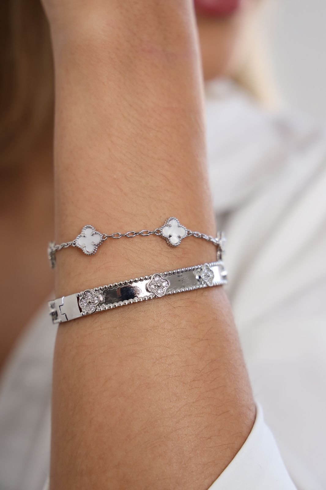 Bracelete Trevo + Pulseira Trevo Madre Pérola, folheado á ouro18 k e a prata em ródio branco.