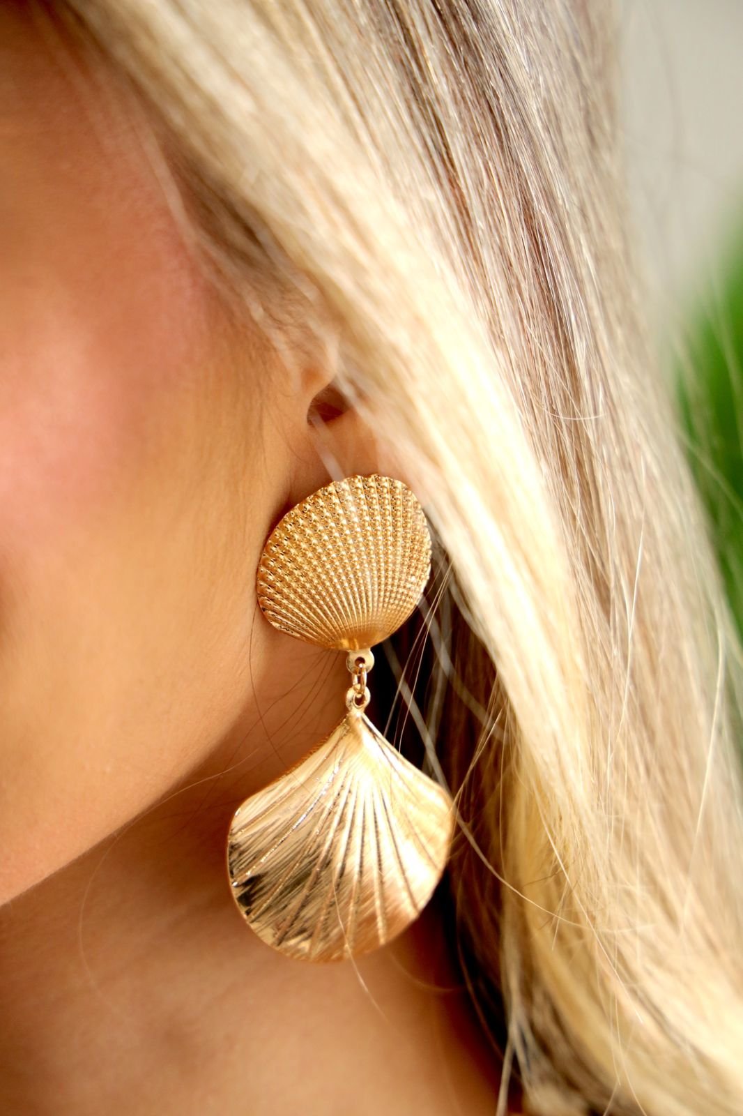 Inspire-se no encanto do mar com este brinco delicado e sofisticado! Com um design em formato de concha pendurada e folheado a ouro de alta qualidade, esta peça traz um toque de elegância e frescor para qualquer produção. Perfeito para quem ama acessórios com um ar natural e moderno.