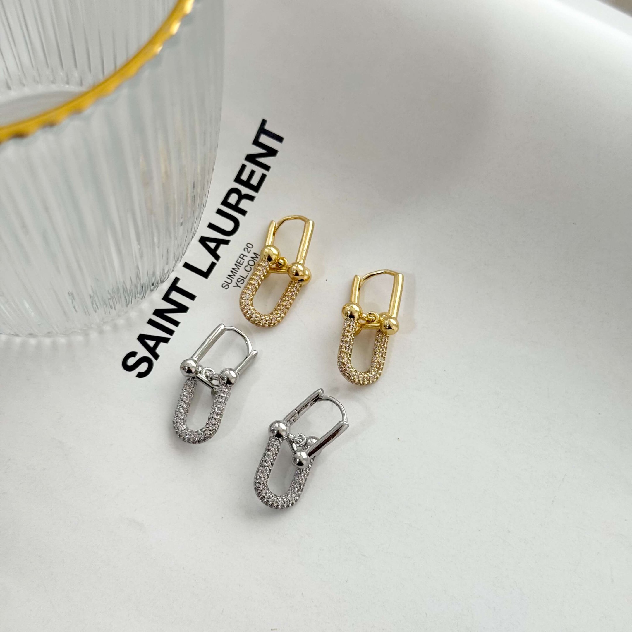 brinco de alta joalheria, brinco cravejado com zircônia, brinco moderno folheado a ouro, brinco prateado de luxo, brinco geométrico feminino, brinco sofisticado, brinco fashionista 2025, brinco dourado e prateado elegante.